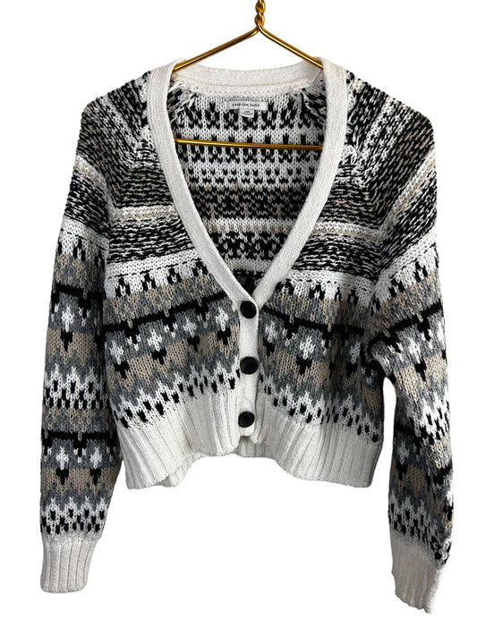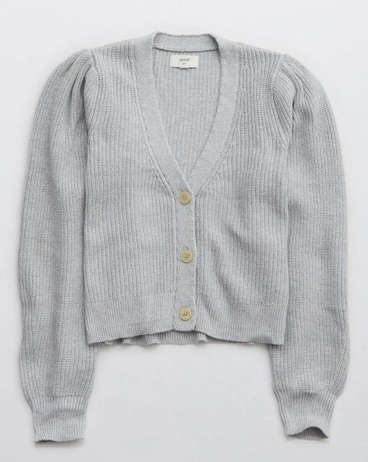 AERIE Women’s Puff Sleeve Knit Gray Cardigan Button Cropped Sweater