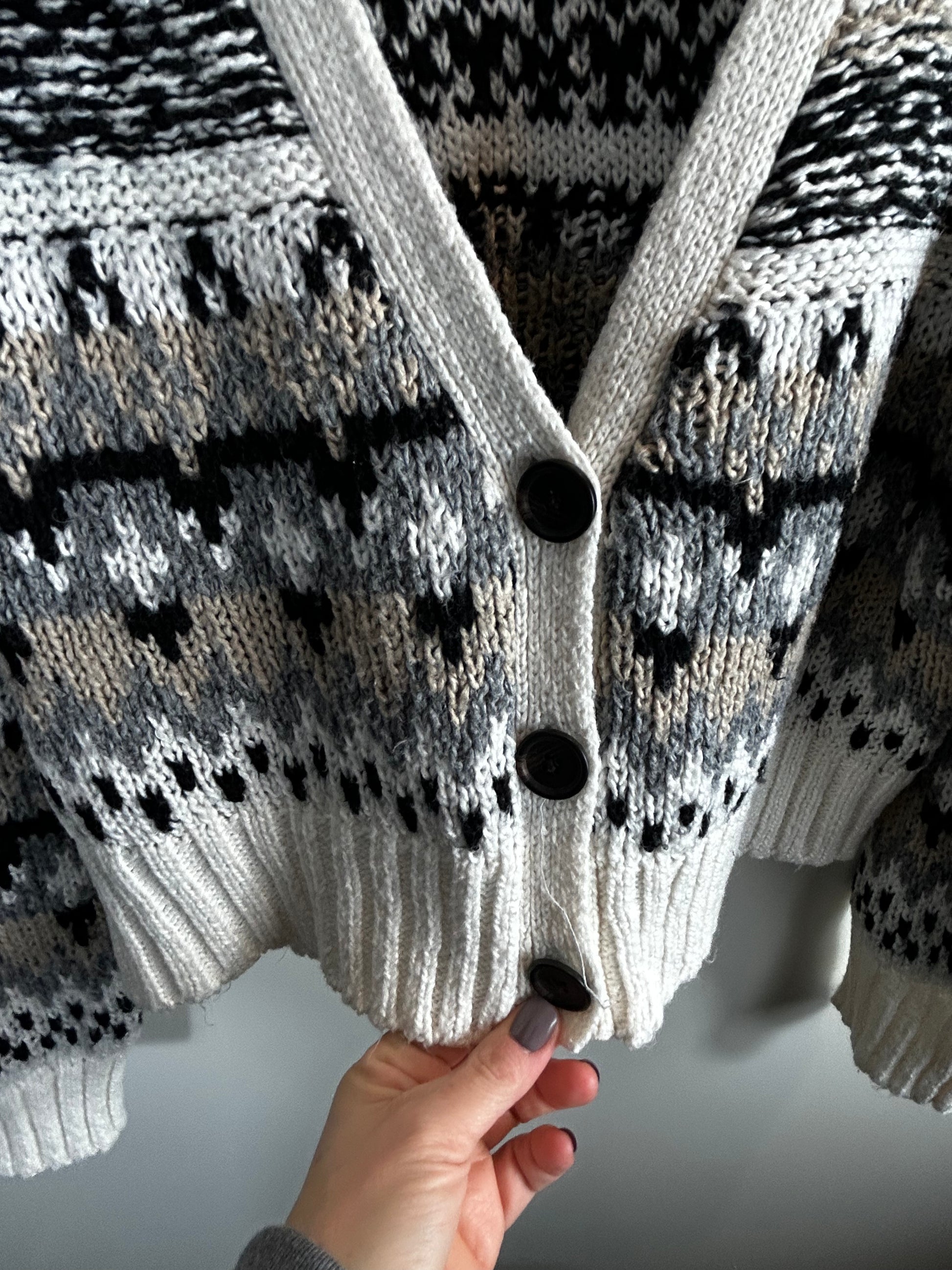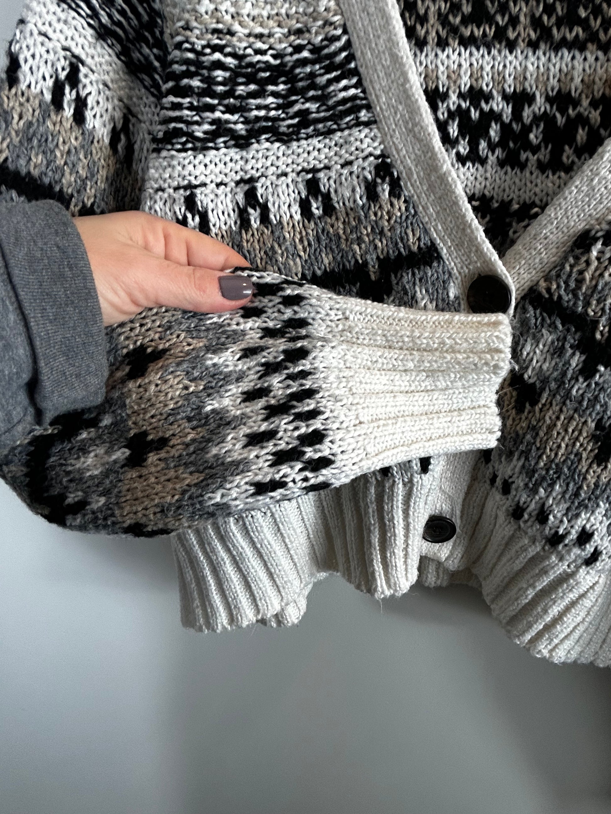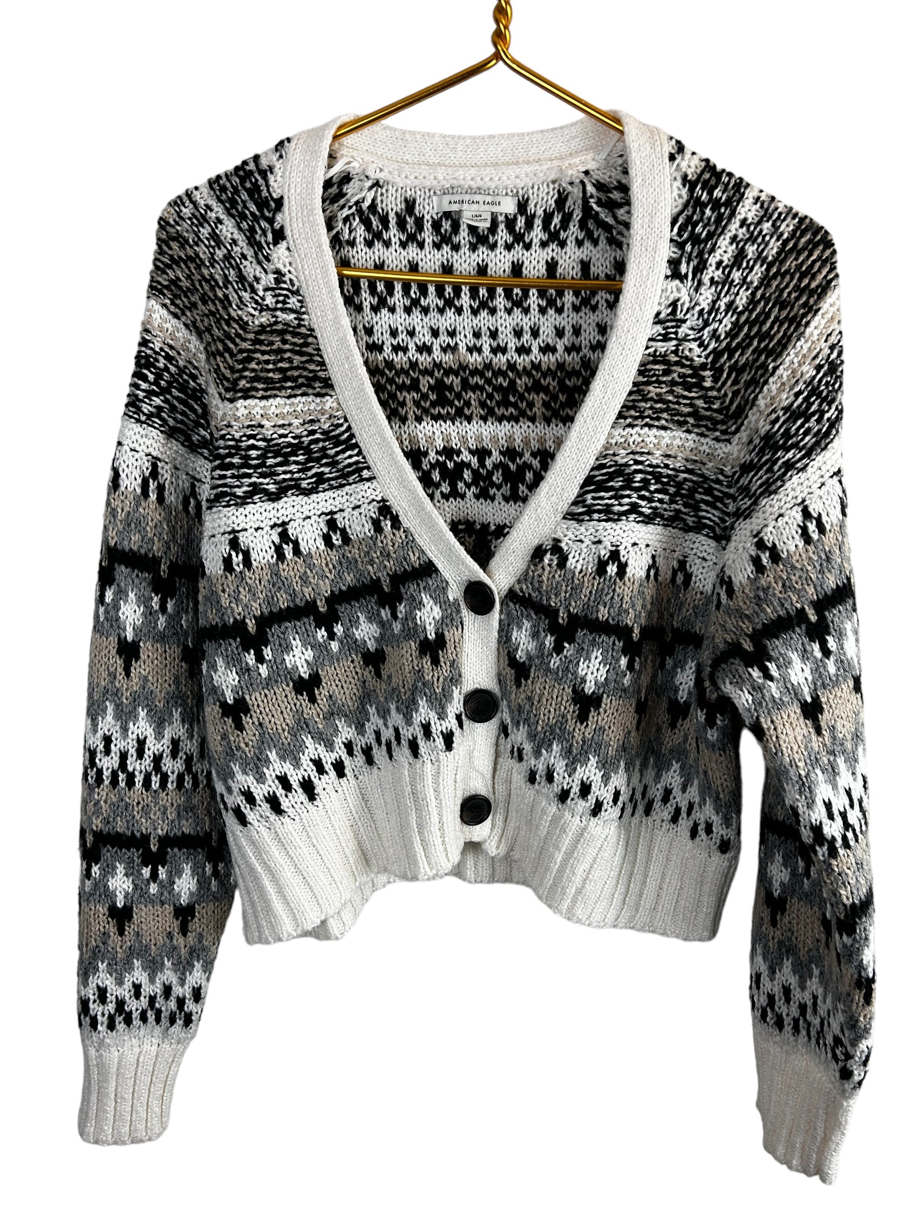 Black, grey, and white Fair Isle style cardigan from American Eagle, size large .