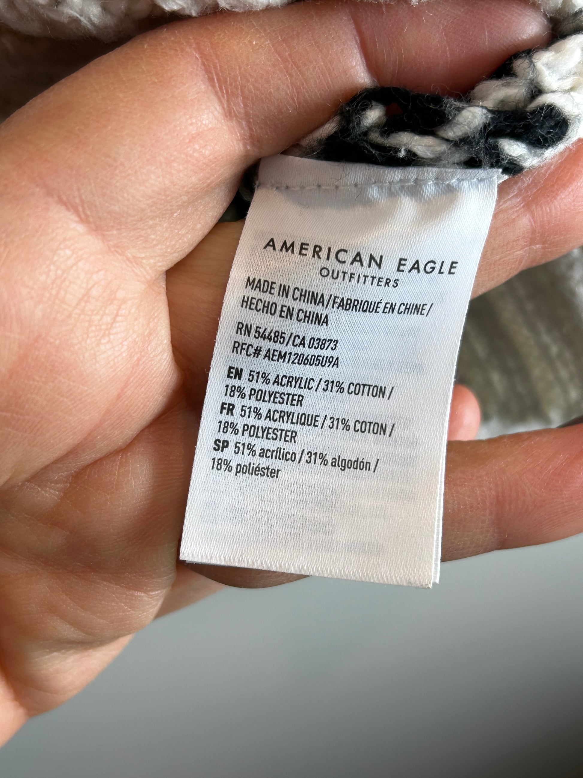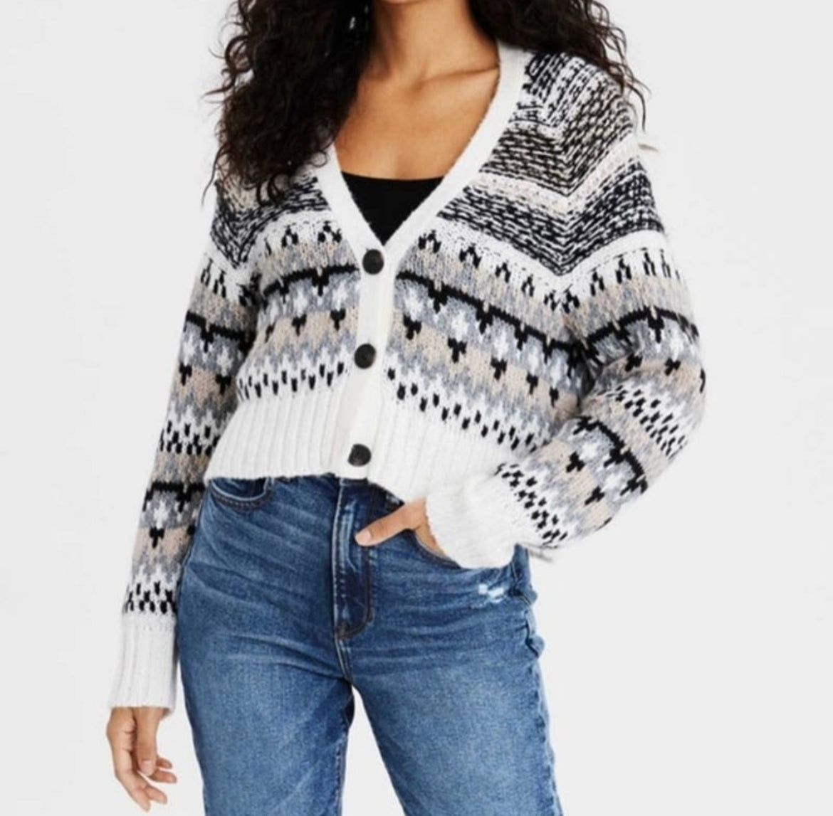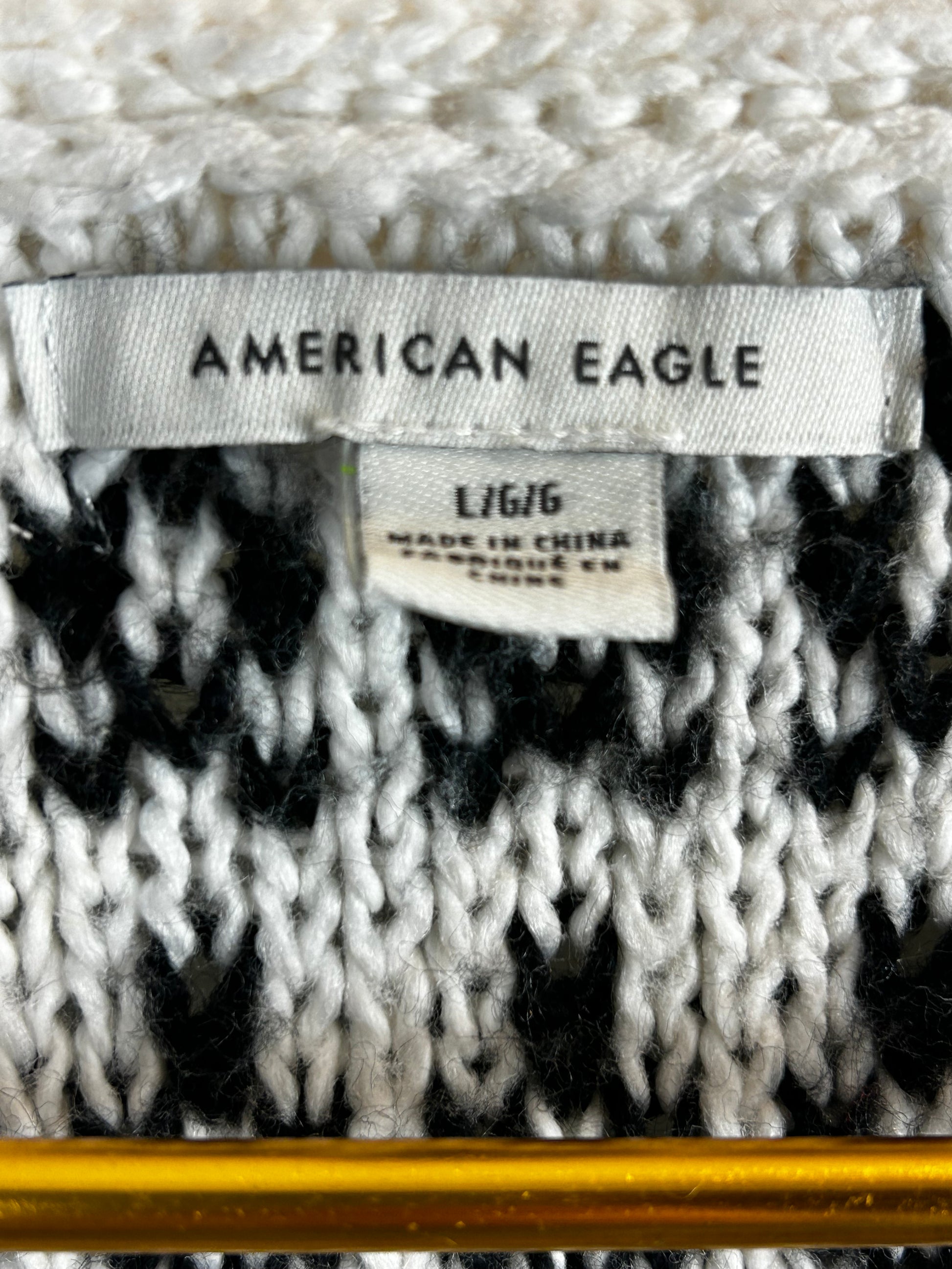 Black, grey, and white Fair Isle style cardigan from American Eagle, size large .