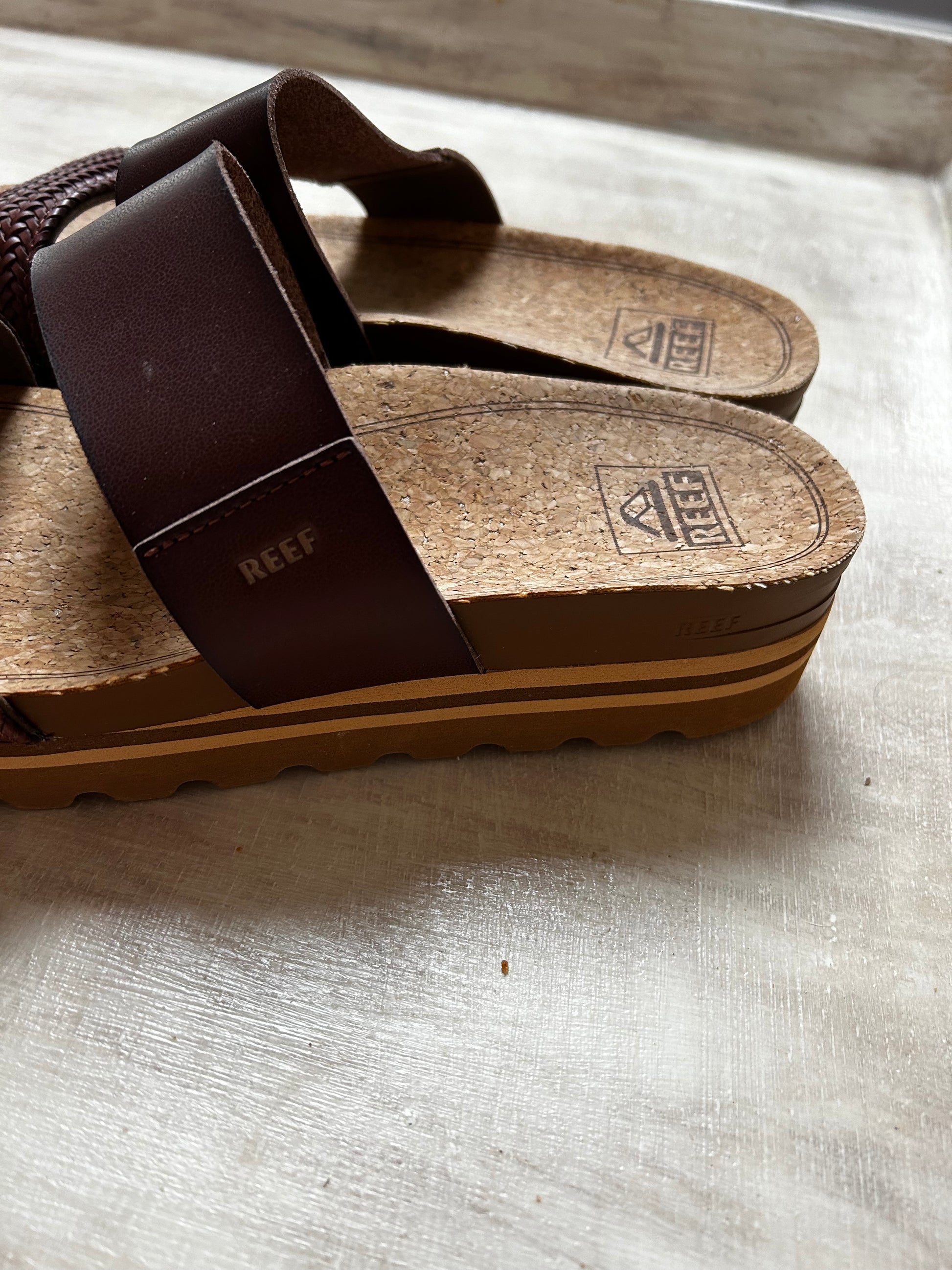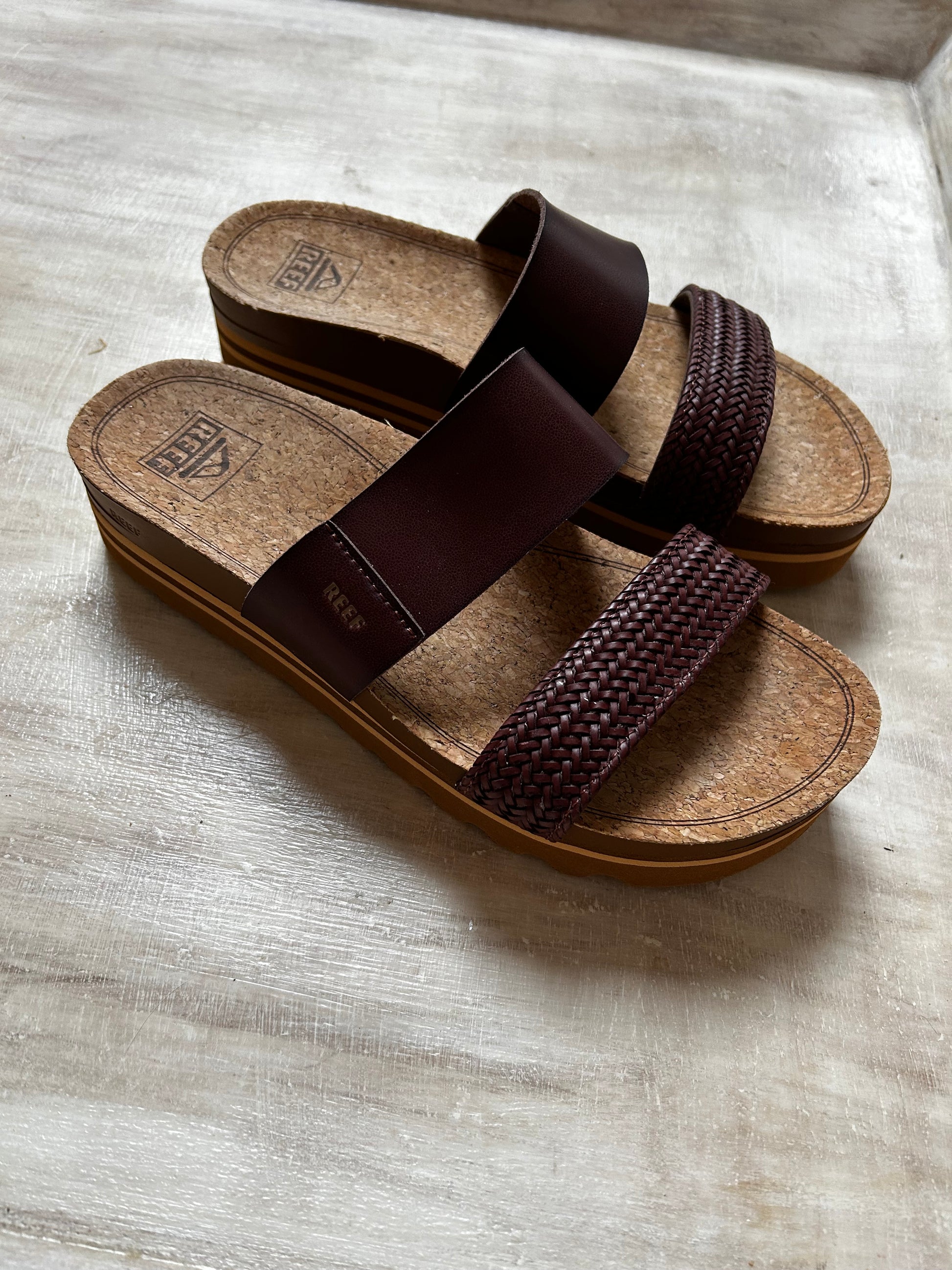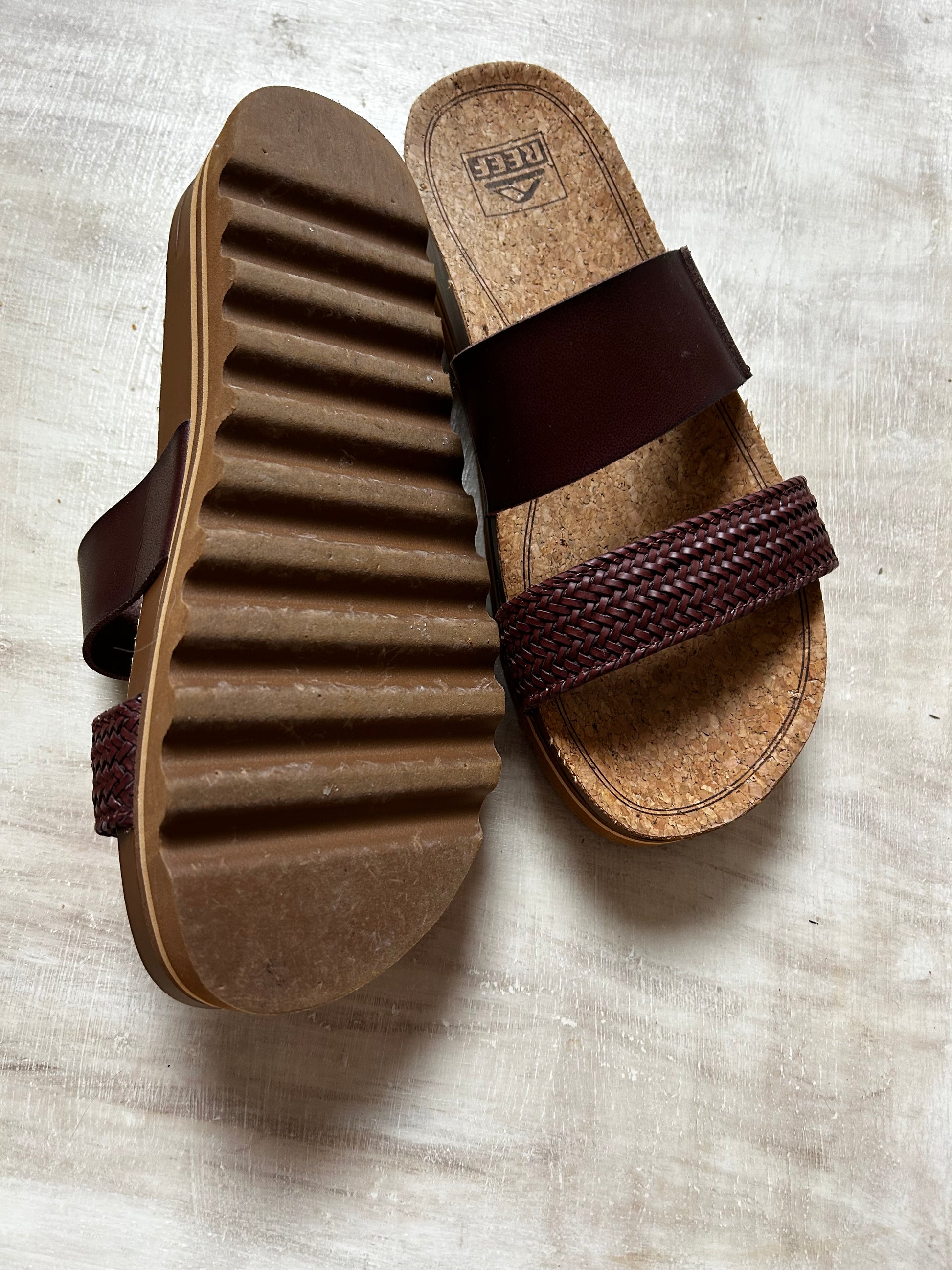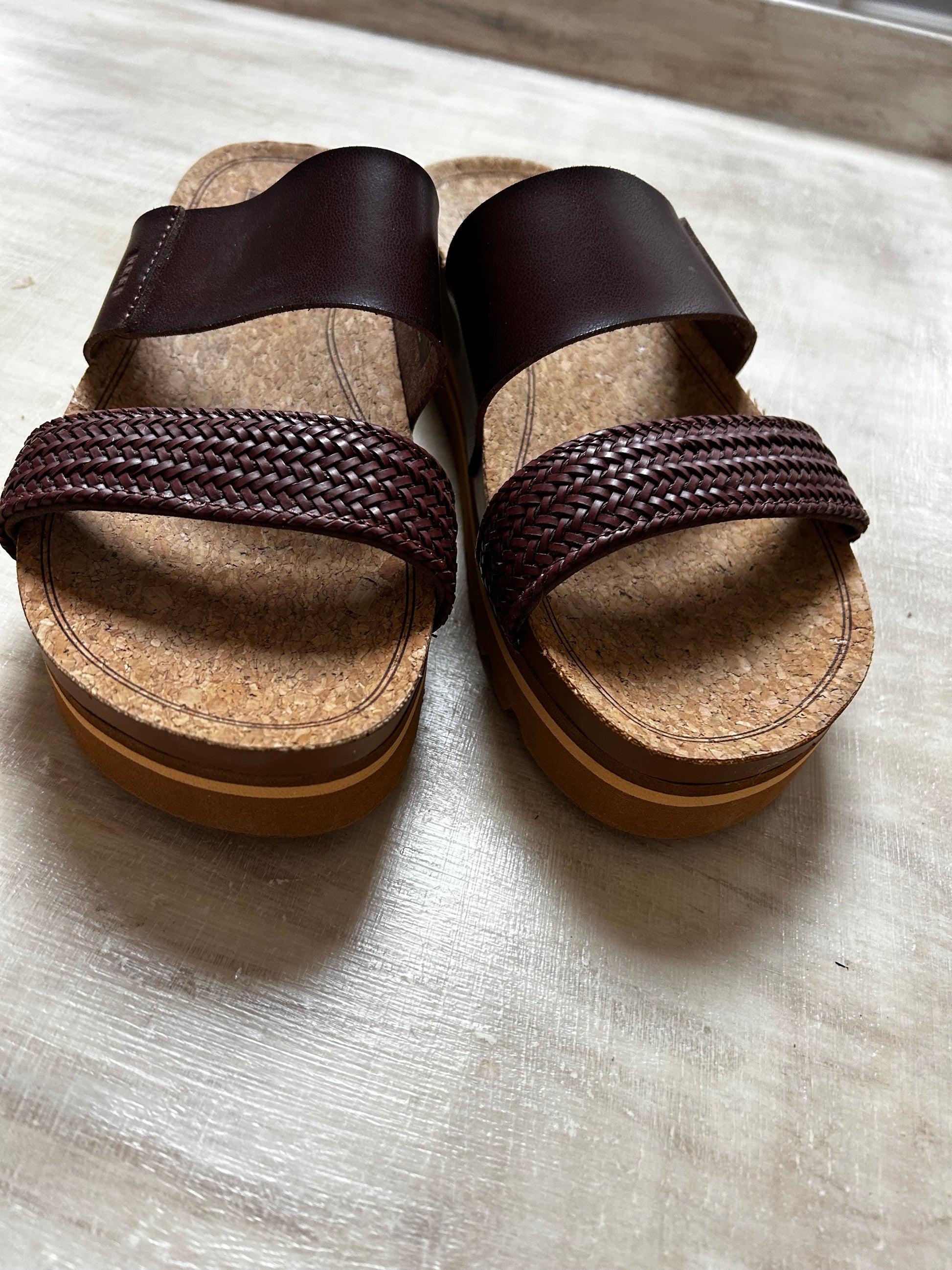 A classic two-strap slide in vegan leather. Down below they’ve got a lug design outsole that adds height (1.75") and style.
