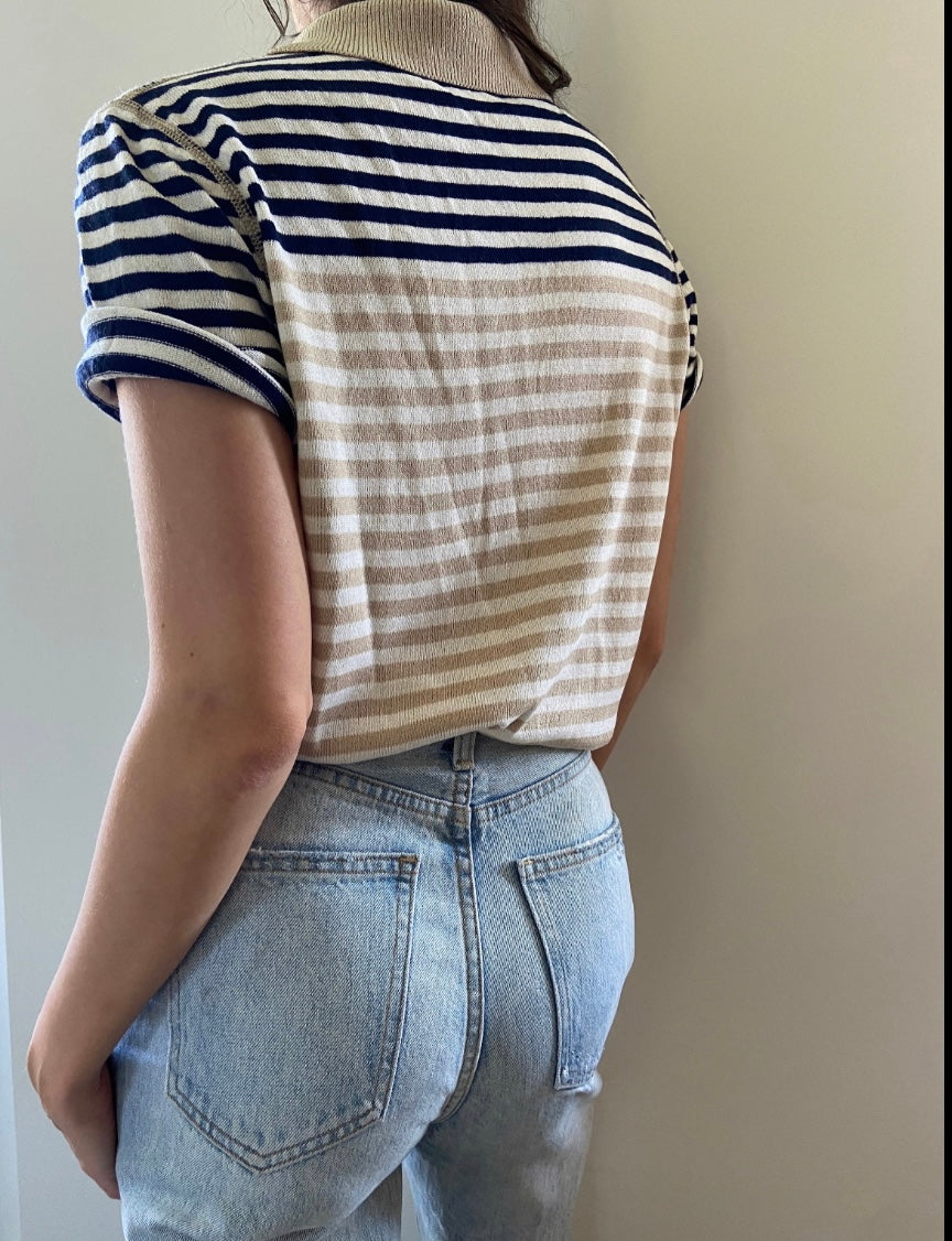 Vintage 90s striped knit polo / minimalist navy white beige short sleeve top / Johnny collar shirt /