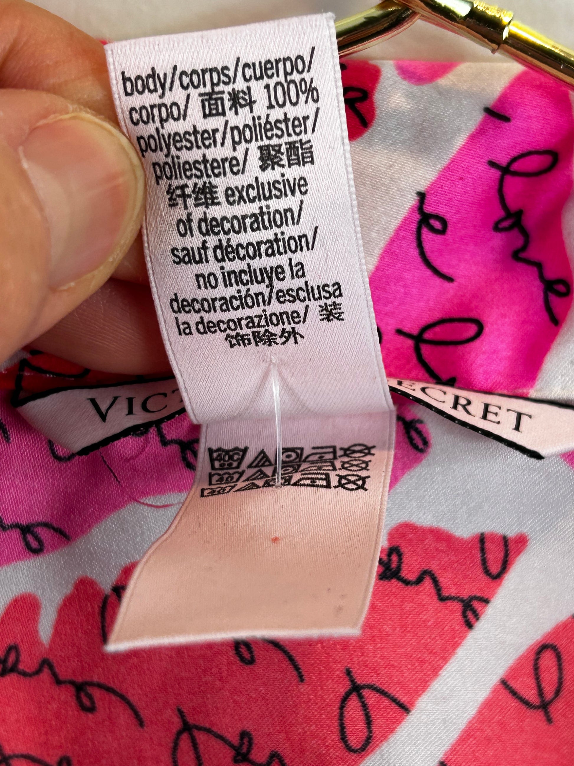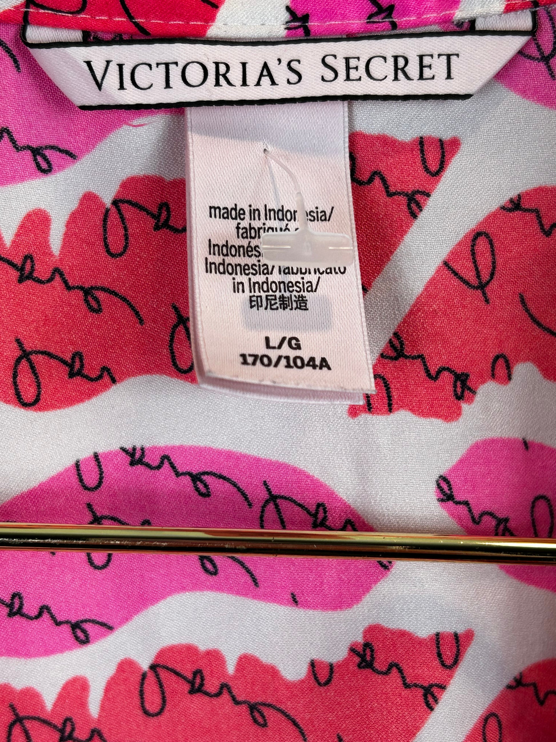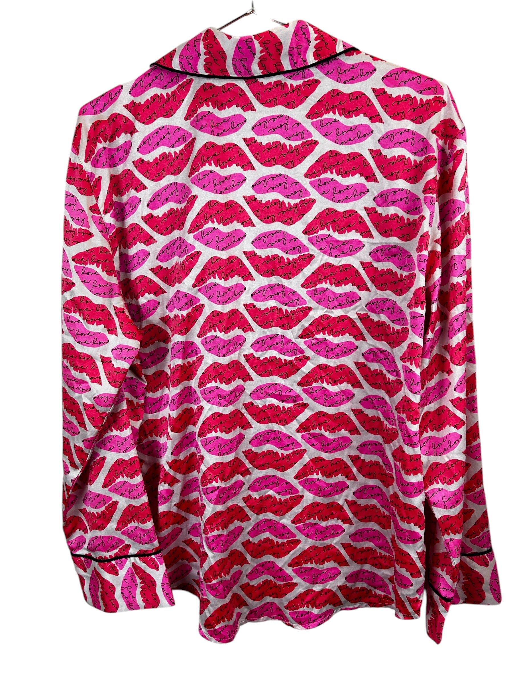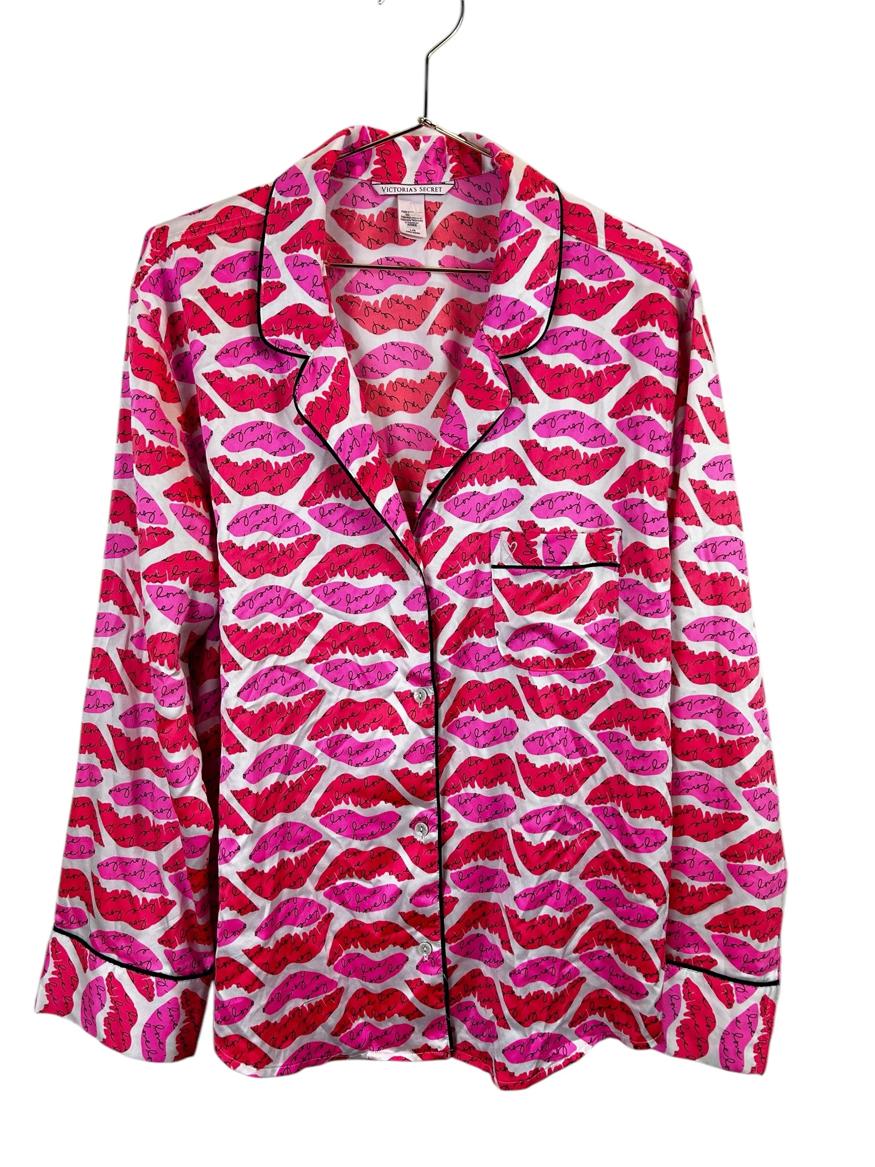 Made of lightweight poly satin, this large size top features a button-down neckline and a vintage red and pink lip print with Victoria's Secret logo accent.